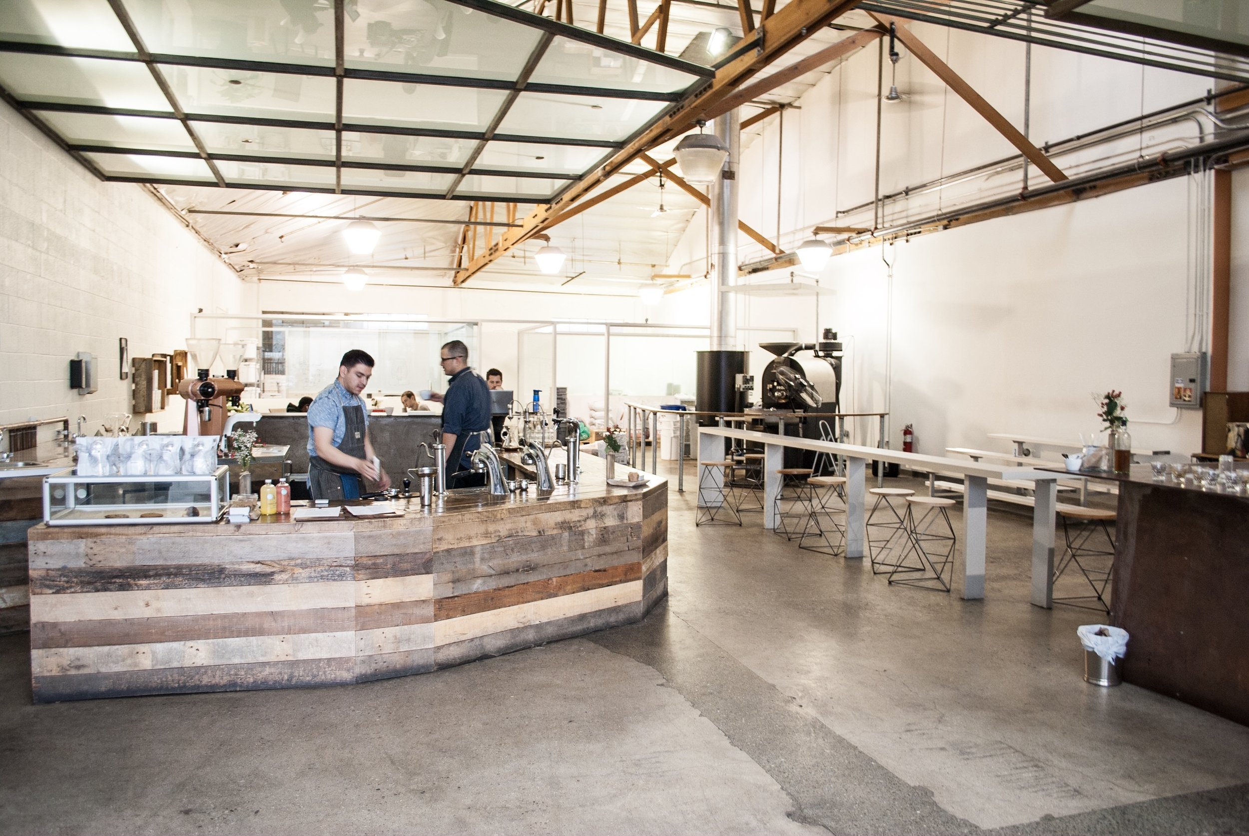 The space is huge; a former food truck kitchen sprawling 3400 square feet. It's open and bright, punctuated with thoughtful, minimal details like a cupping bar, a row of metal bleachers, a community table, and bar stools that could double as works of art. There's 70's funk music playing, and stacks of old vinyl alongside the record player.